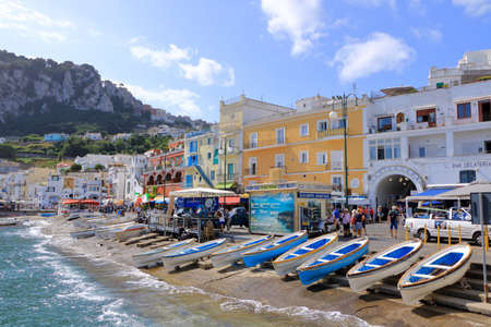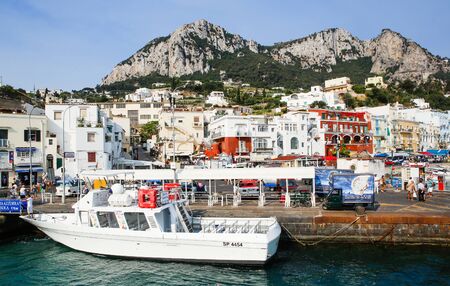 Capri island, Italy. Marina Grande pier - excursion boats taking numerous tourists on trips around the island