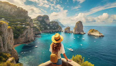 Back view of young woman in white dress and straw hat looking at beautiful view on Capri island, Italy, Holidays on Capri Island, Back view of a beautiful fashion girl enjoying the view, AI Generated