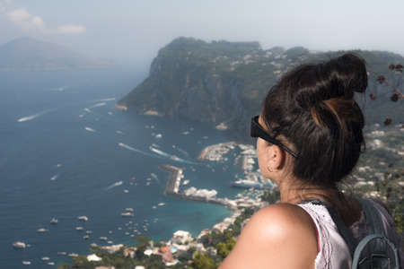 Pretty woman from behind with sunglasses and backpack facing the sea from the top on a sunny summer day. Capri island.