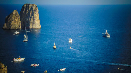 Beautiful panorama of small bay full of small ships and boats next to Faraglioni di Mezzo and Capri island