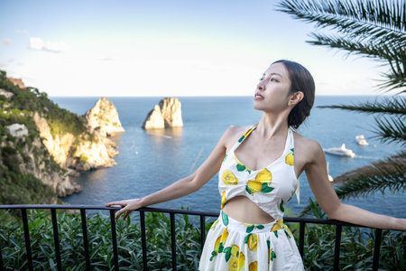 Woman enjoy view of beautiful coastal cliffs faraglioni di mezzo from Giardini di Augusto in Capri, Italy.