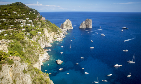Panoramic view of famous Faraglioni Rocks, most visited travel attraction of Capri Island, Italy. Beautiful paradise landscape with azure sea in summer sunny day.