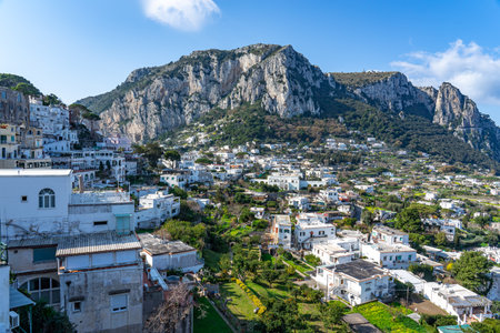 Touristic Town on Capri Island in Bay of Naples, Italy. Sunny Blue Sky.