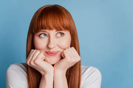 Photo of lady look empty space with fists on chin think isolated on blue background