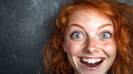 A close-up portrait of a joyful woman with vibrant red hair and bright eyes. Her exuberant smile radiates happiness against a dark background, capturing pure emotion and energy.