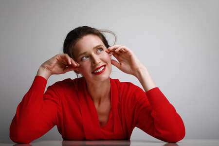 portrait of a red-haired woman on a gray background in dark clothes makeup model