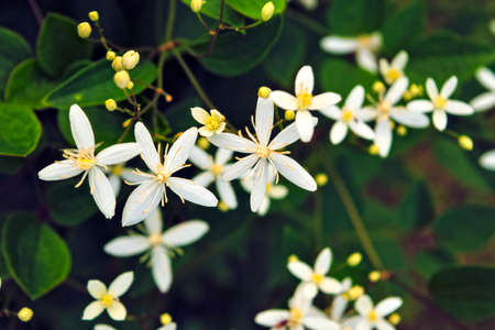 Clematis flammula, known by the common name fragrant virgin's bower. White flower close-up on a blurred background. It it is cultivated worldwide as an ornamental plant in gardens.