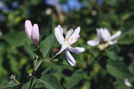 Japanese Honeysuckle blooming plant outdoors. White fragrant flowers in summer park.