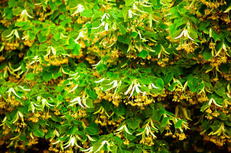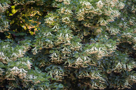 Blooming branchs linden tree outdoors on a sunny day. Small-leaved linden Tilia. The healing properties of linden flower tea.