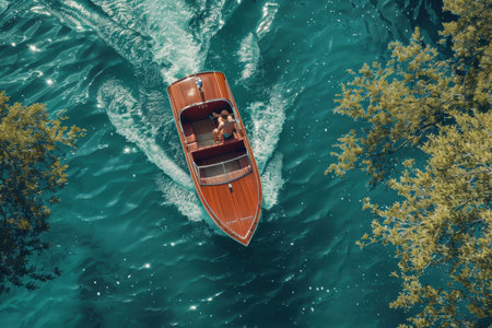 An aerial view captures a wooden motorboat navigating vibrant turquoise water. The boat, with its polished wood and streamlined design, creates white wakes. Overhead lighting illuminates the scene, highlighting the textures of the water and the boat. This image is suitable for various commercial uses, including advertising and editorial content.