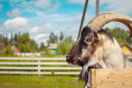 Close-up portrait of a goat on the background of a wooden fence. Farming concept
