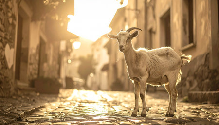 In the heart of an old-world village, a goat pauses on a cobblestone path, its silhouette framed by the brilliant, hazy light of a rising sun. This tranquil moment captures the timeless beauty of rural life and quiet exploration.