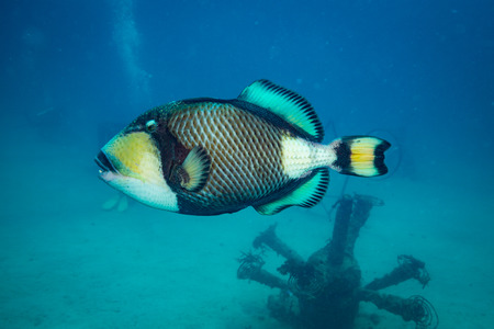 large titan triggerfish swimming and looking to the camera while diving in the red sea