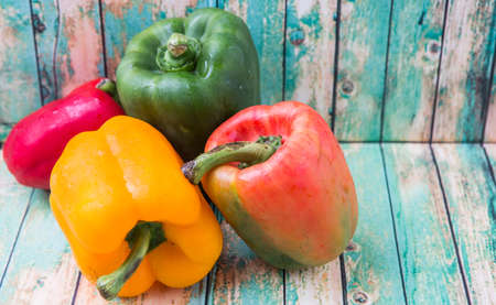 Fresh yellow, red and green bell peppers on wooden background, Organic vegetables
