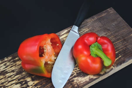 Knife cutting red pepper on wooden board.