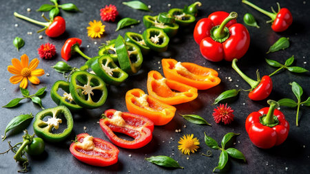 Colorful sliced bell peppers and flowers on dark surface with basil leaves. That the image is generated using AI.