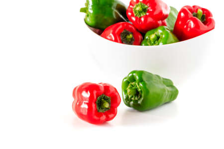 Red and green capsicums or bell peppers in a wooden bowl on white background