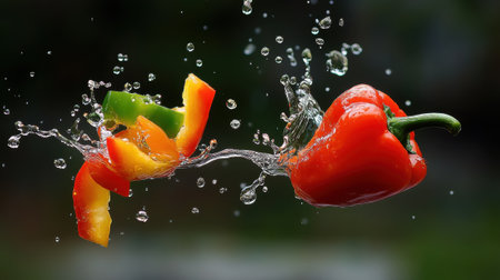 Red and green bell peppers splash in water.