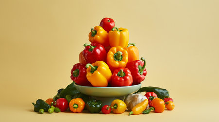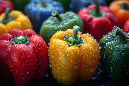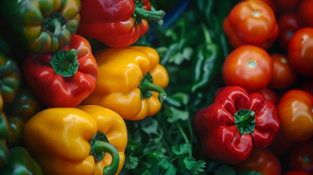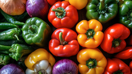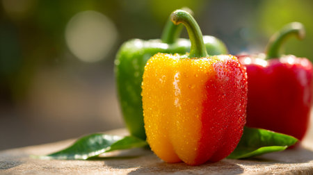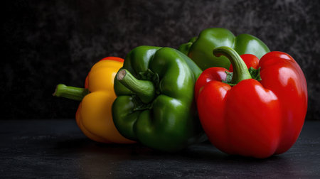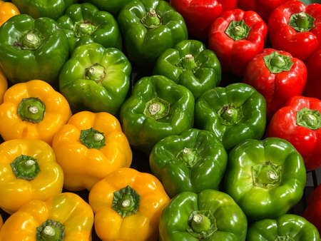 Colorful bell peppers background fresh green, red, and yellow vegetables backdrop