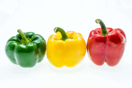Close-up of three bell peppers in a row on a white background, with copy space, horizontal