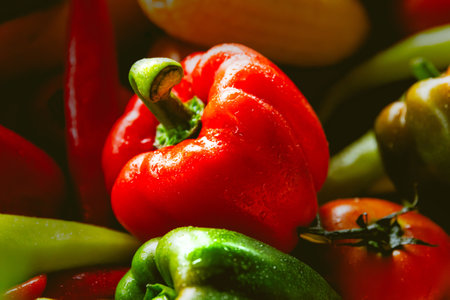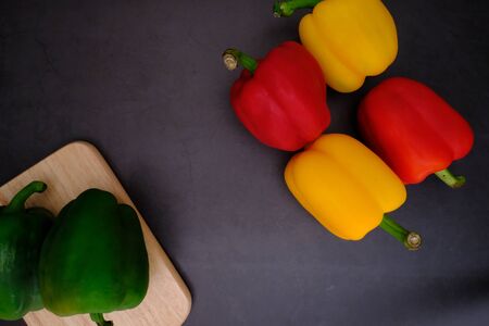 Red green yellow pepper in the kitchen black beautiful background