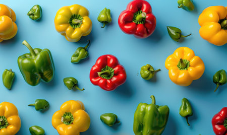Top view of a variety of bell peppers on a pastel blue background