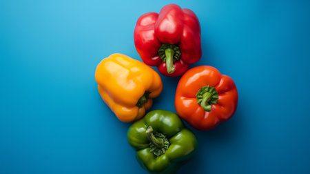 A vibrant assortment of colorful bell peppers, including red, yellow, green, and orange, placed against a bright blue background.