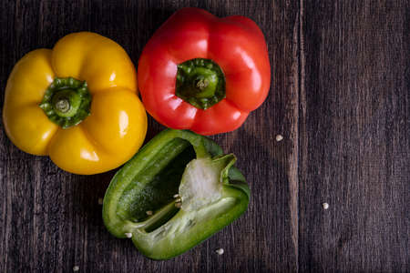 Red, yellow and green bell peppers on wooden background. Top view.