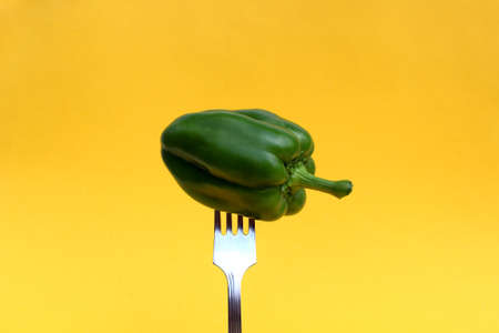 Green pepper is planted on a fork on a yellow background.