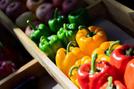 Red, green and yellow bell peppers in the vegetable box at the market.