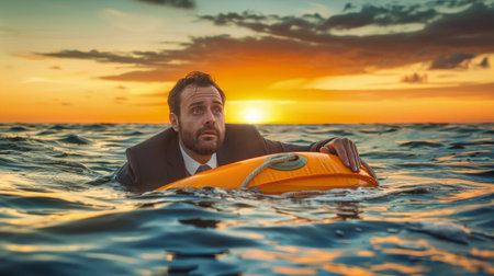 A businessman dressed in a suit floating in the ocean wearing an orange life preserver, symbolizing resilience and hope.