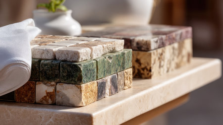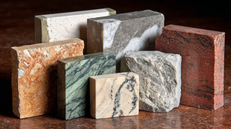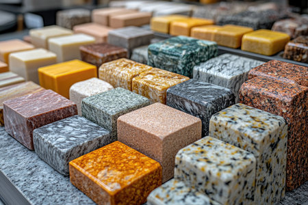 A close-up of different types and colors of granite samples, arranged in an organized grid on the table. The focus is placed on one square tile that stands out for its rich texture and warm color. This material adds depth to your kitchen or bathroom design with its natural beauty and low maintenance requirements. Use it as a decorative stone for a bold statement. --ar 3:2 --stylize 750 --v 6.1 Job ID: 26451293-5555-422f-938b-907c8dbcb3b8