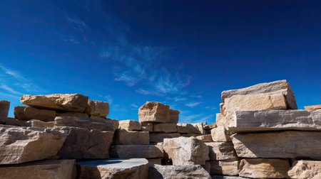 Building blocks are meticulously arranged in a pyramid shape under a bright blue sky. The texture of the blocks contrasts with the clear atmosphere.