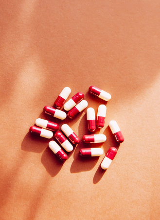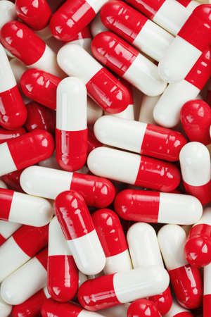 Red and white capsules on a colored background