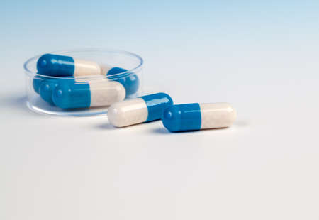 Colorful medical capsules in Petri dishes. Laboratory concept.