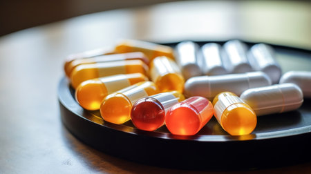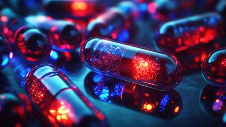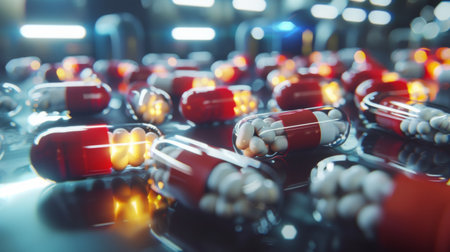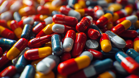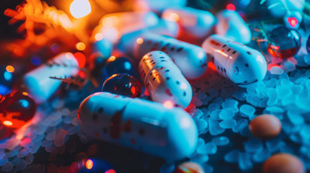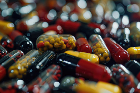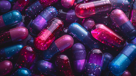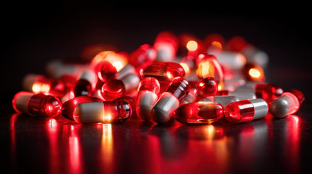 Colorful capsules and pills scattered on dark surface create striking visual. vibrant red and white colors reflect light, evoking sense of intrigue and curiosity
