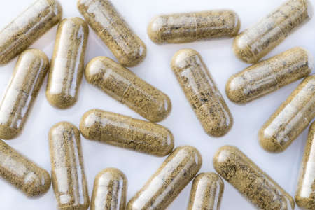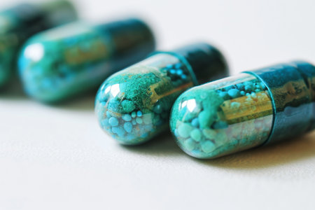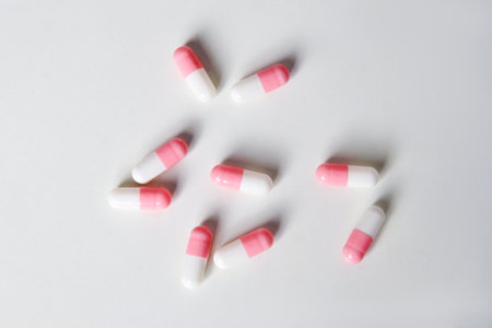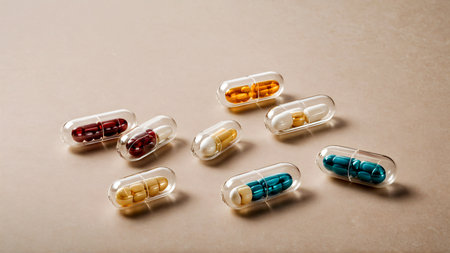 Pharmaceutical capsules over white backdrop.