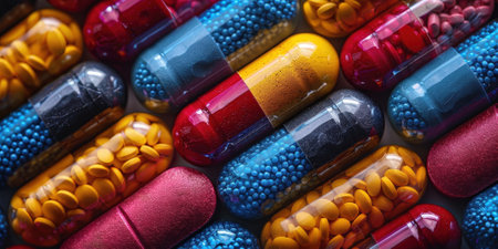 Assorted colorful medical pills and capsules in vibrant close up flatlay composition