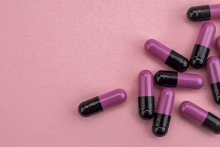 Many medicines purple and black pills capsules on pink background