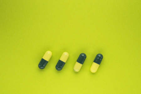 Green and yellow medical capsules on a green background. top or above view
