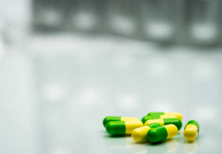 Green, yellow tramadol capsule pills on blurred silver blister pack background with copy space. Cancer pain management. Opioid analgesics. Drug abuse in teenage