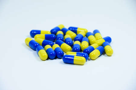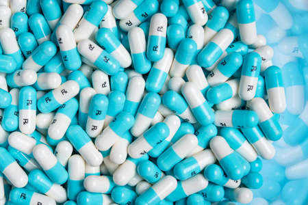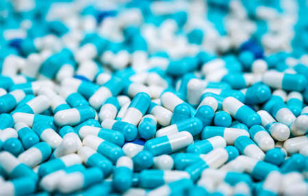 Selective focus on pile of blue and white antibiotic capsule pill. Pharmaceutical production. Global healthcare. Antibiotics drug resistance. Antimicrobial capsule pills. Pharmaceutical industry.
