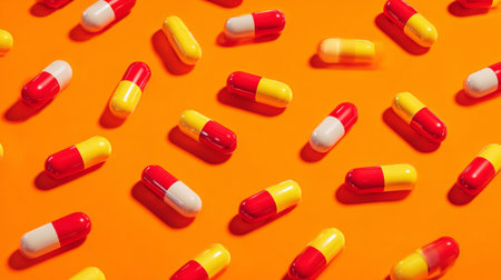This vibrant image showcases a scattered arrangement of red and yellow capsules on a bright orange background, creating a lively visual impact.