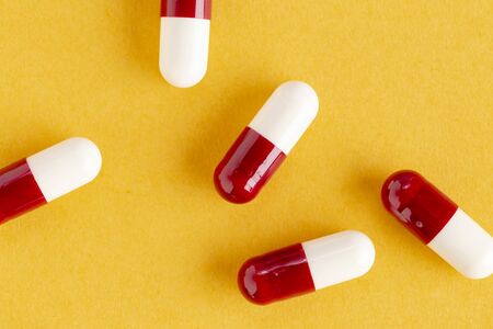 Red-white antibiotic capsule pills on yellow background. Prescription drug. Antibiotic drug resistance concept. Pharmaceutical industry. Pharmaceutics. Pharmacy product. Pharmacy drugstore banner.