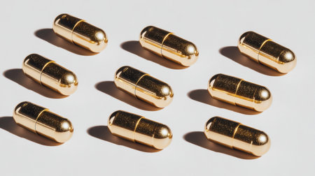 A stunning arrangement of golden capsules on a clean white background, showcasing their shiny surface and modern design perfectly.