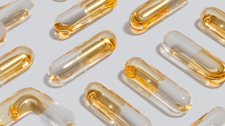 A striking arrangement of transparent capsules filled with golden oil and white substances, creating a clean and modern aesthetic for health-related themes.