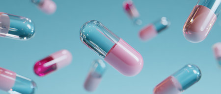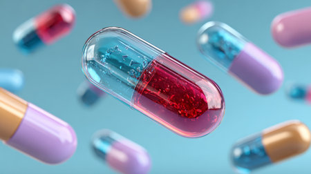 Colorful 3D capsules floating on blue background. Generative AI