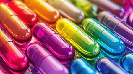 A row of colorful pills are lined up on a table. The pills are of different colors and sizes, creating a vibrant and eye-catching display. Concept of variety and diversity