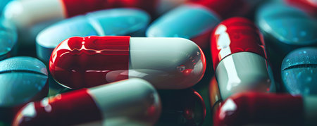 Pills in blue and red capsules, close-up, background