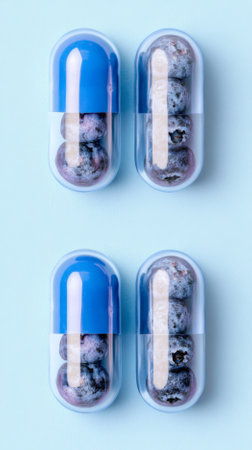 Blueberries in capsule transparent on light blue background, AI generated